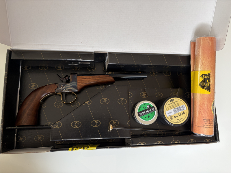 Verkaufe eine Perkussionspistole Pedersoli Saloon Kaliber 4,5 mm neu und ungeschossen inklusive dem nummerngleichen Karton, Anleitung, Setz-Stab für die Rundkugeln, einer Dose Rundkugeln und Zündhütchen beides ungeöffnet und vollständig (kann gerne nachgezählt werden). Das System ist wunderschön buntgehärtet, insgesamt tadelloser Neu-Zustand. Die Flecken am Lauf sind nur vom Öl. Ich habe die Waffe vor einem Monat neu gekauft und komme einfach nicht dazu mich ausreichend damit zu beschäftigen. Original Rechnung mit dementsprechender Restgarantie wird mitgeliefert. Da aus Privatverkauf ohne Rücknahme oder Garantie.