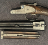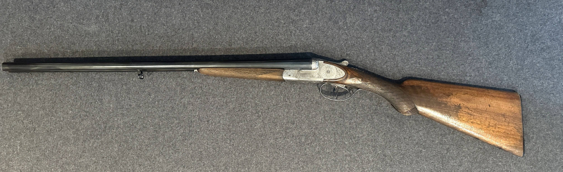 Diese belgische Querflinte mit langen Seitenplatten im Kaliber 16/65 hat einen Schaft ohne Backe. Lauflänge 68 cm.