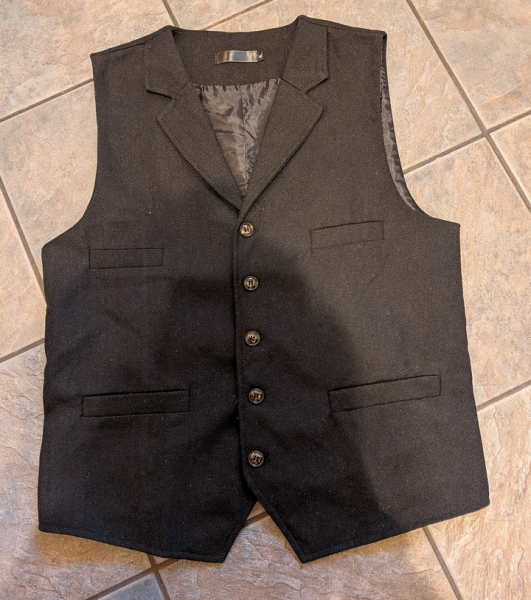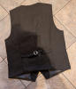 verkaufe: eine Old Style Weste - angegeben mit Größe XL (Maße: Gesamtlänge ca. 65 cm, einfache Breite über die Brust von Naht zu Nacht unter den Armauschnitten gemessen ca. 52 cm) - schwarzes Wollmischgewebe, Hornknöpfe, Verstellriegel am Rücken - neuwertig, nie getragen, hing nur im Schrank (Siehe Fotos!)