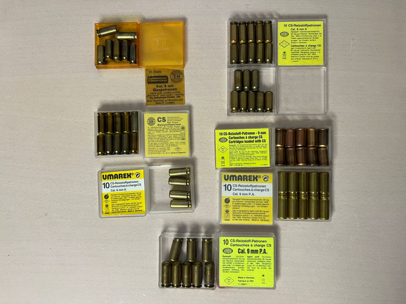 Zum Verkauf steht ein Konvolut aus CS Kartuschen im Kaliber 8mm & 9mm PAK für Schreckschuss Waffen.
