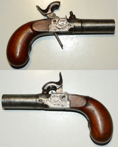 Kleines Perkussions-Terzerol mit graviertem Kasten, abschraubbarer Lauf (sitzt fest), Klappabzug, Lauflänge 4,2 cm, Gesamtlänge 13,3 cm, Kaliber10,7 mm, alter belgischer Beschuss, etwas Alterspatina aber guter optischer und technischer Zustand