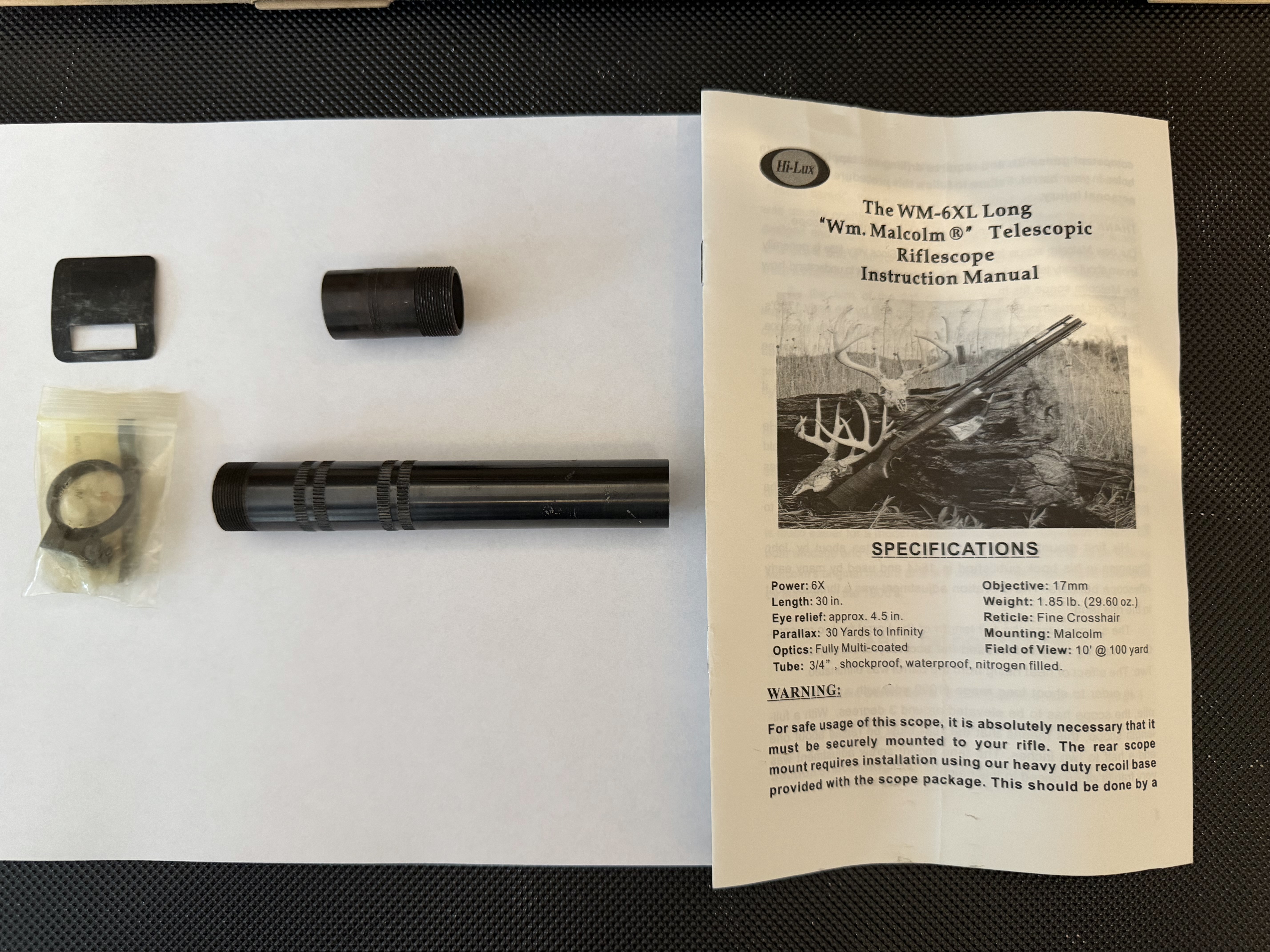 Das Pedersoli Malcolm ZF 6 x 15 lang, Hunting 88cm USA hat einen Stahltubus mit 19mm Außendurchmesser, 6-fache Vergößerung und Fadenkreuz und es ist geeignet für Lauflängen von 28-32", kann mit der zusätzlichen Verlängerung für kurze Läufe verändert