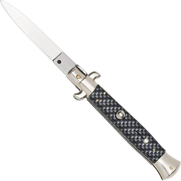 Die Sicherung im Griff verhindert ein unbeabsichtigtes Aufspringen der Klinge. Die Griffbeschalung ist aus Kunststoff im Carbonfiber-Look.