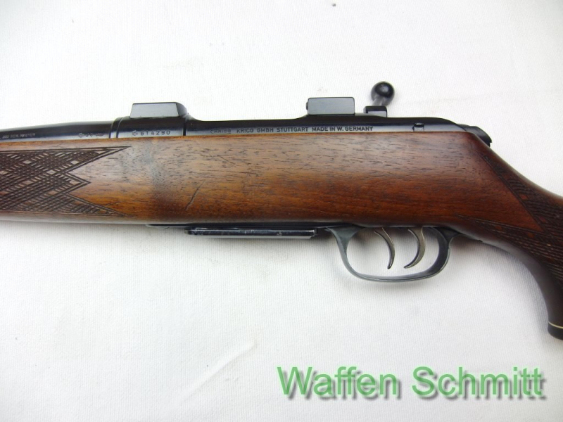 Sie bieten auf eine Repetierbüchse Krico Mod.700 im Kaliber .222Rem.Mag. montiert mit EAW Schwenkmontagebasen. 60cm Lauflänge mit Korn und ohne Visier (Lauf von innen ohne Mängel), seitliche Schiebesicherung, deutscher Stecherabzug, herausnehmbares 4-Schuß Magazin, Nußbaumholzschaft mit deutscher Backe, Riemenbügel. Schaftlänge 35,5cm, Gesamtlänge 109,5cm. Gebrauchsspuren auf der Waffe. Einwandfreie Funktion!!!
