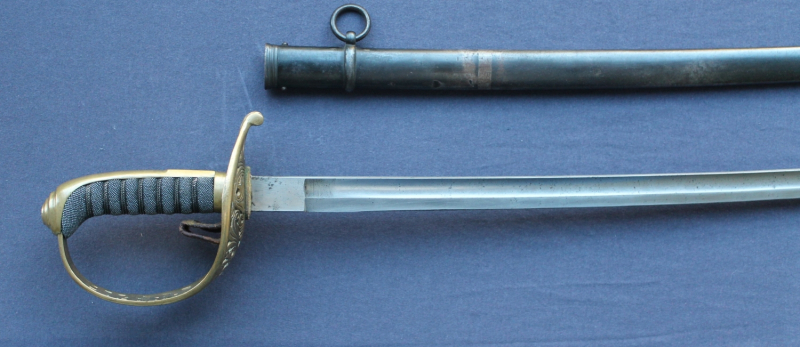 Blattförmig durchbrochenes Korbgefäß aus Messing mit zwei Portepee-Schlitze über der nach unten abgebogenen Endknopf-Walze. Leder-Fingerstrippe unter kanneliertem Griffring. Gerundete, ganze Griffkappe mit abgeflachter Daumenauflage, zum Knauf hin konzentrisch kanneliert. Flacher Vernietkopf. Gerillte Holzgriff-Hülse mit Fischhautüberzug und dreilagiger, verdrillter Messingdraht-Wicklung.
