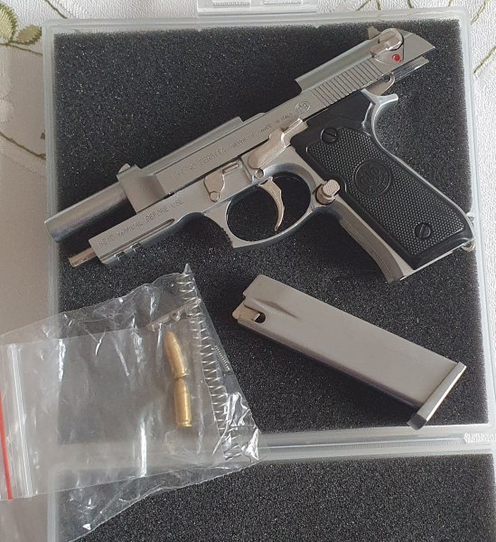 Biete eine Modelpistole Beretta Mod.92A1 zum Verkauf an. Sie kann gespannt und abgeschlagen werden. Das Magazin ist entnehmbar. Die enthaltenen Dummypatronen können geladen und durchrepetiert werden. Zudem kann man die Pistole wie das Original demontieren und montieren.