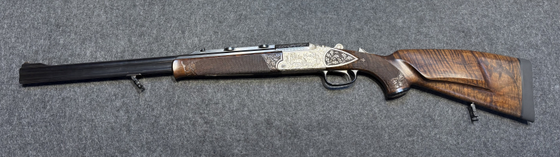 Diese Blaser Bockdoppelbüchse verbindet klassische Doppelbüchsen-Eleganz mit moderner Handspanntechnik. Die tiefgestochene Gravur mit Wildmotiven und umlaufendem Eichenlaub verleiht der Waffe einen sehr repräsentativen Charakter. Ein starkes Stück für den erfahrenen Jäger oder Liebhaber hochwertiger Kipplaufwaffen.