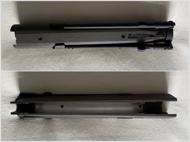 Das abnehmbare Zweibein ist ein paar Grad drehbar gelagert, um Bodenumebenheiten auszugleichen. Im Handschutz ist natürlich auch ein Hitzeschutzblech eingenietet. Dieser Trapezvorderschaft ist kaum noch zu bekommen und wird nur sehr selten angeboten! Sehr guter Zustand, leichte Gebrauchsspuren, voll funktionsfähig, keine Beschädigungen.