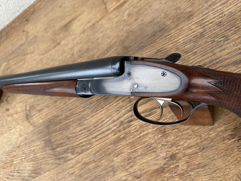 Verkauft wird eine Seitenschloß Doppelflinte Kal. 12/70, Hersteller BRNO,doppelter Laufhakenverschluß mit zusätzlicher Sperrung auf innenliegendem Greener.Verschluß dicht, Läufe blank, Doppelabzug, Lauflänge 72 cm, Schaftlänge 38 cm ,ventilierte Schaftkappe mit Lederüberzug.Laufriemenbügel fehlt