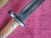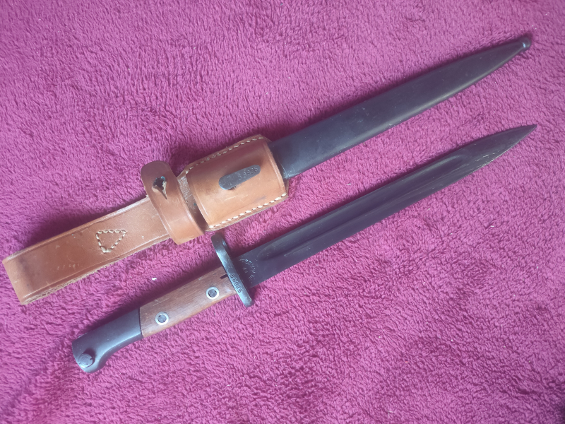 Bajonett mit Holzgriff und Stahlscheide. Verriegelung gängig. Beschriftung Hersteller: ? 58925 auf dem Bajonett und auf der Stahlscheide. Könnte ein Nachbau sein. Ich kenne mich da nicht aus.