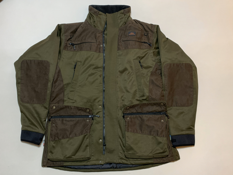 Die Jagdjacke hat eine 130 g/m2-Thermore-Isolierung. Die 2-lagige Covertex-100-Membran macht die Jacke wind- und wasserdicht. Die Jacke hat einen klassischen langen Schnitt. Die abnehmbare Kapuze ist mit einer Kordel versehen, um die Kapuze eng verschließen zu können. Der Ellbogenbereich, Tasche und Schulter ist zusätzlich verstärkt und extra abgesetzt in Braun. Wassersäule 10.000mm,atmungsaktiv 10.000 g/m2/24h, winddicht durch Covertex 100: 2-lagige Membran, Thermore-Isolierung 130 g/m2, Belüftungsreißverschlüsse unter den Armen, 2-Wege-FrontRV, 2 Funkgerätetaschen auf der Brust mit verdecktem Reißverschluss, 2 verschließbare, gefütterte Handwärmetaschen, 2 Vordertaschen verdeckt, auf den Vordertaschen aufgesetzte Taschen mit verdecktem Reißverschluss und Knöpfen Hasentasche beidseitig mit RV, 3 Innentaschen, am Saum und Kragen verstellbar, innenliegende Kordel zur Verstellung im Hüftbereich, verstellbarer Ärmelbund. Die Jackenseite ist unten mit Druckknöpfen versehen, damit man beim Sitzen evtl. den Front-RV nicht öffnen muss.----Ich verkaufe die Jagdkleidung, weil diese mir zu groß ist.
