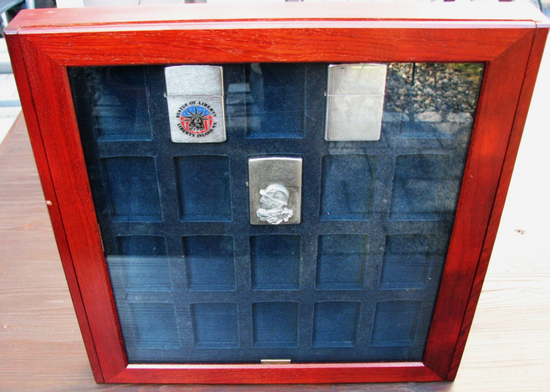 Hier ein gebrauchter Schaukasten (Holz) für 20 Zippo Benzin Feuerzeuge. Mit 3 gebrauchte Feuerzeuge.