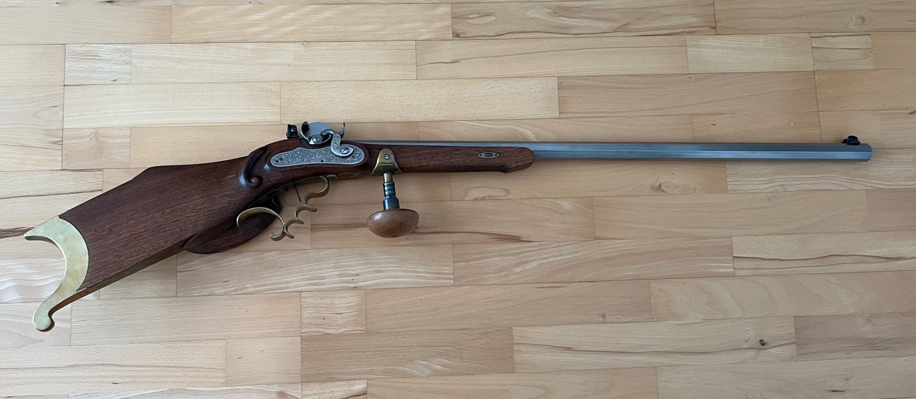 Das Gewehr ist eine originalgetreue Neuauflage mit Nußbaum Backenschaft, blank poliertem Achtkantlauf in sehr gutem Zustand und 7 ca. 0,30 mm tiefen Zügen. Gravierte Schlossplatte und Hahn. Voll funktionsfähig.