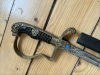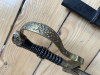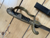 Aus Sammlungsauflösung wird ein Wehrmachts-Löwenkopfsäbel mit Scheide angeboten. Die ca. 79,5 cm lange Klinge ist altersgemäß fleckig und rostnarbig. Eine Herstellermarke ist nicht (mehr?) zu erkennen". Der Griff ist mit schwarzem Kunststoff belegt, die Wicklung ist intakt. Alle Metallteile am Gefäß sind aus Messing. Das Gefäß selbst sitzt leicht wacklig auf der Klinge. Die roten Steine im Löwenkopf sind beide noch vorhanden. Die Stahlscheide ist beulenfrei und der Tragering scheint aus Messing zu sein. Der Verkauf dieses gebrauchten Artikels erfolgt von Privat unter Ausschluss jeglicher Gewährleistung, Garantie, Sachmängelhaftung und Rückgabemöglichkeit. SHIPPING ONLY TO DESTINATIONS INSIDE EU!