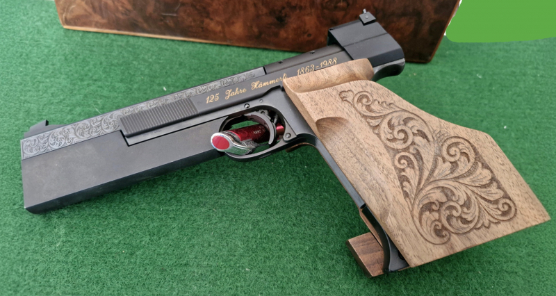 Beschriftung der Pistole links in Gold. 125 Jahre Hämmerli 1863 - 1988