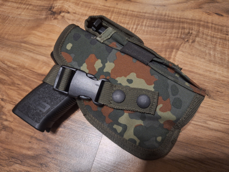 Sie bieten hier auf ein stabiles Holster aus hochwertigem Cordura im 5 Farben Flecktarn. das Holster kann am Gürtel, oder mittels der rückseitigen Klettfläche auf der Einsatzweste, Leg-Extender o.ä. befestigt werden. Der zusätzliche Sicherungsgurt ist abnehmbar. Mit Magazintasche. Unbenutzt im Bestzustand. Die Waffe (RG96/P8) dient lediglich zur besseren Veranschaulichung und ist nicht im Angebot enthalten. Beachten Sie auch meine anderen Auktionen. Bei Fragen gerne melden und viel Spaß beim Bieten...