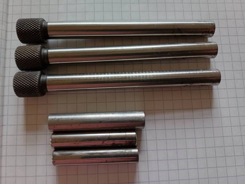 Sie erwerben Kaliberprüfdorne Abbildung kurz. Maße: 7,94 mm, 7,94 mm, 8,88 mm gemarkt Pistole P08. Kaliberprüfdorne lang, Maße: 8,83 mm, 8,85 mm, 8,86 mm. Die Prüfdorne sind in einem altersbedingten Zustand, kein Rost. Es handelt sich um eine Privatauktion unter Ausschluss jeglicher Gewährleistung.