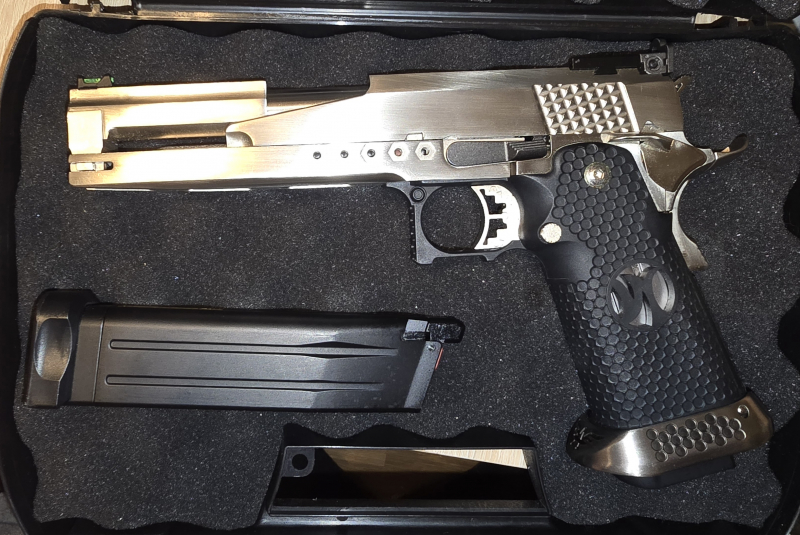 Hallo, biete hier eine AW Custom HX2201 5.3 sceleton, 6mmBB, GAS an, in nickel. Die waffe hat Blowback, hat minimale gebrauchspuren, waffe ist aus Metall, sie ist dicht und hat ein F zeichen. Mit dabei ein Waffenkoffer, 2. Magazin. Was aussieht wie Flecken auf der waffe sind nur Öl Spuren von der Pflege. Waffe ist ungeschossen. Absoluter sammlerwaffe. Neipreis über 280€