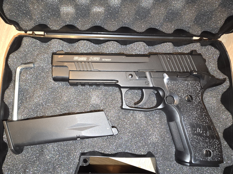 Hallo, biete hier eine Sig Sauer P226 S X-Five, 6mmBB, CO2 an, in schwarz. Die waffe hat Blowback, hat gebrauchspuren, waffe ist aus Metall, sie ist dicht und hat ein F zeichen. Mit dabei ein Waffenkoffer, sechskantschlüssel und 2. Magazin. Was aussieht wie Flecken auf der waffe sind nur Öl Spuren von der Pflege.