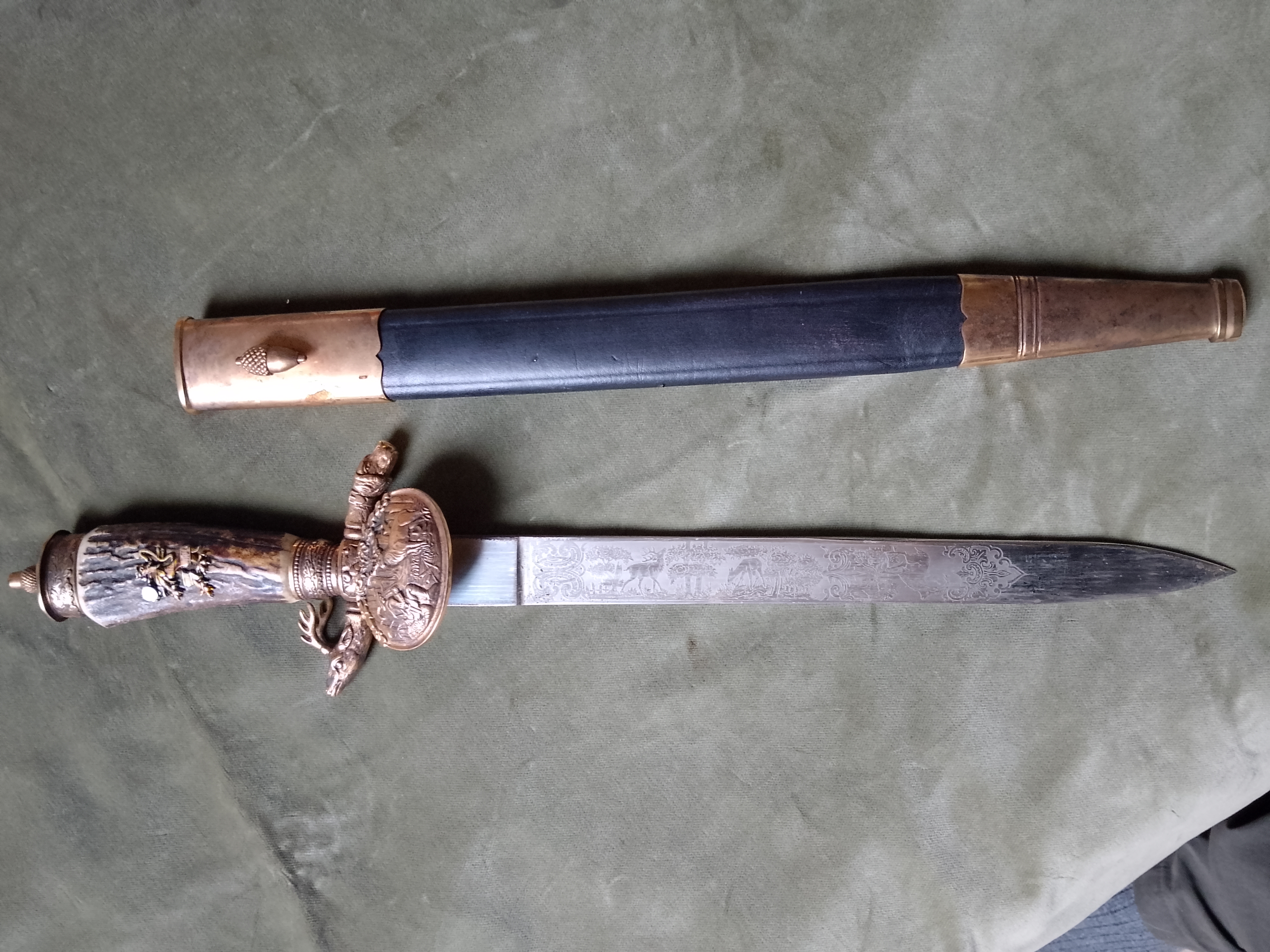 Messing Montur mit echt Hirschhorn Griff, mir unbekanntes Emblem, Siehe Bild, Löwe mit Hakenkreuz, diese geprägt und mit Solingen befestigt, dreifach geätzte sehr massive Klinge mit Jagdmotiven, Lederscheide mit aufgekrampten Beschlägen.