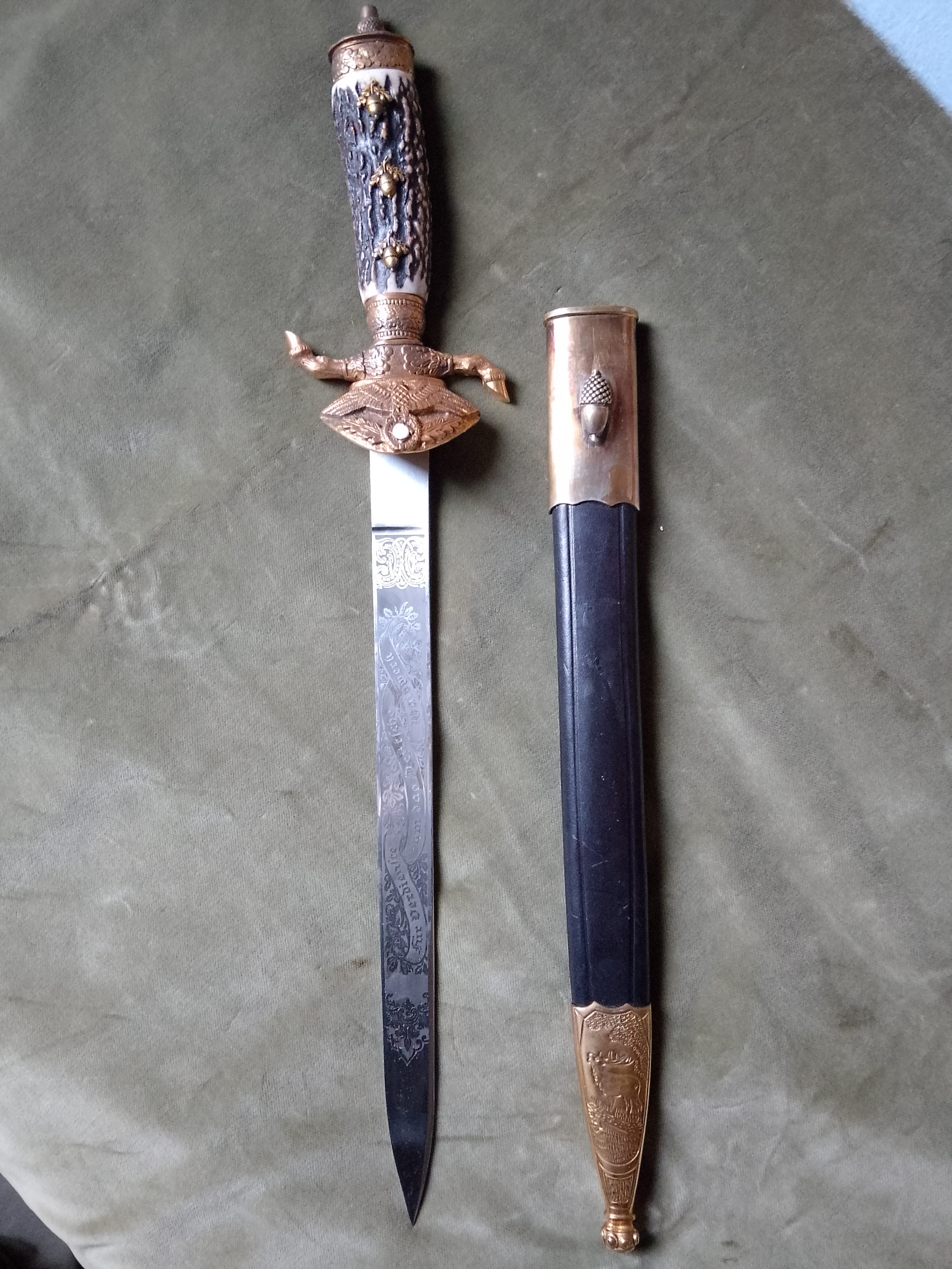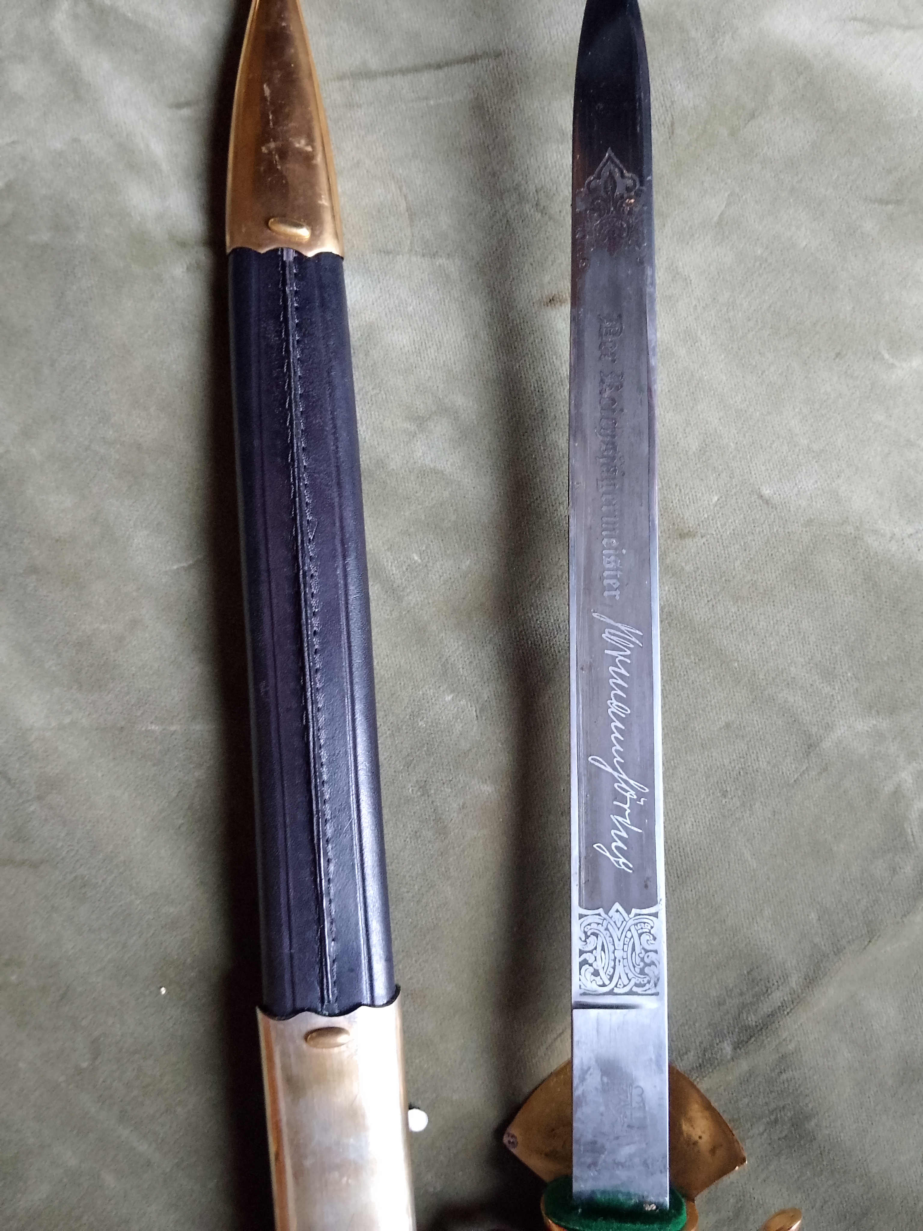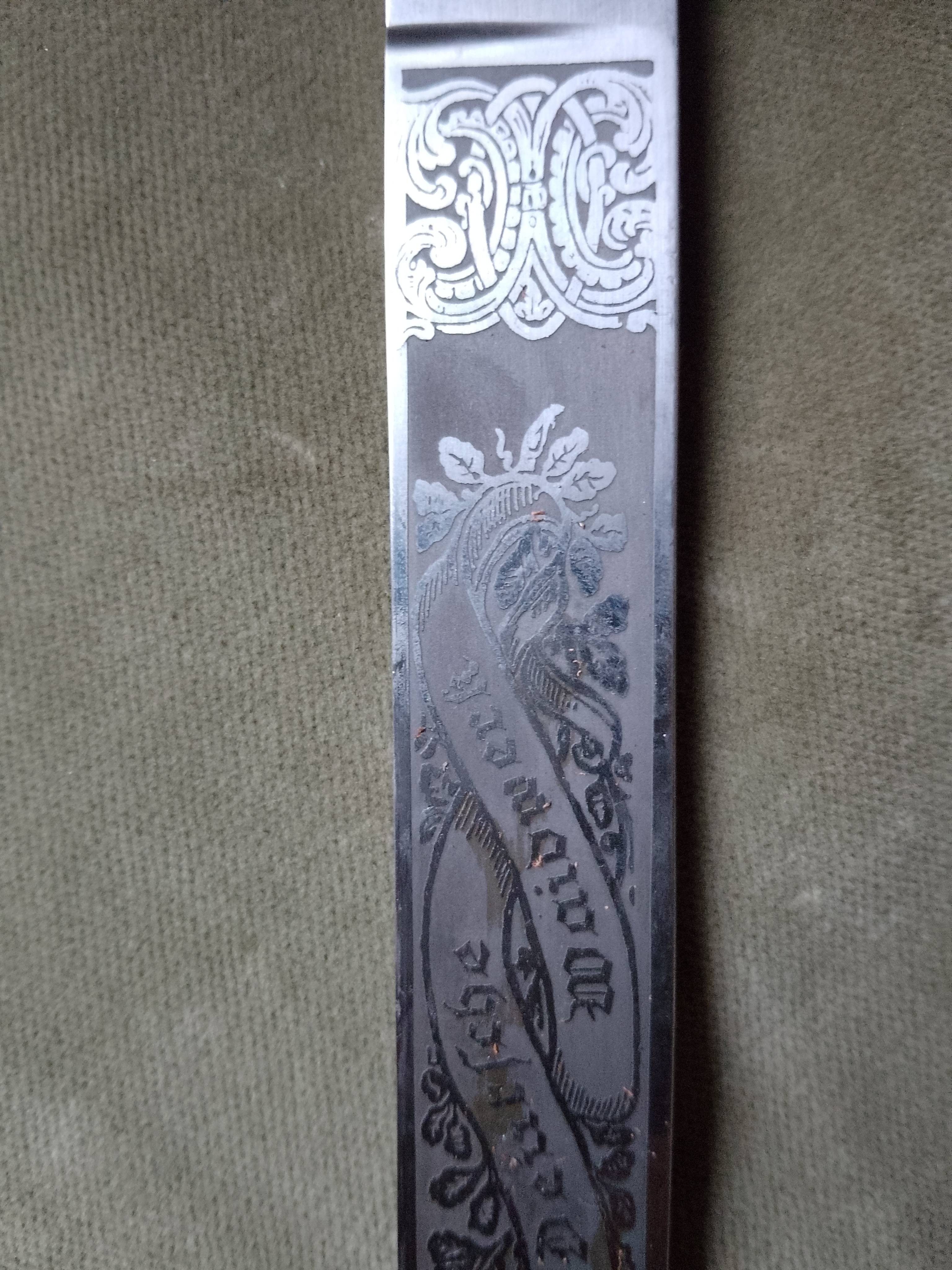 Dreiseitig geätzte Klinge mit Widmung des Reichsjägermeister, Hersteller Eickhorn Solingen.