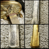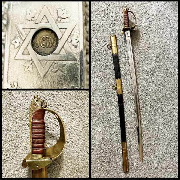 Marinesäbel, 96cm, Einschneidige Klinge mit reicher Musterätzung, Lederscheide mit gravierten Messingfassungen, auf Fehlschärfe eingelegte kleine Plakette mit "HT“ in sechseckigem Stern. Breites Messinggefäß mit Löwenkopf, klappbares Stichblatt, gleichzeitig als Rutschbefestigung für Scheide. Ledergriff mit geriffelter Drahtwicklung. Scheide Leder Weich.