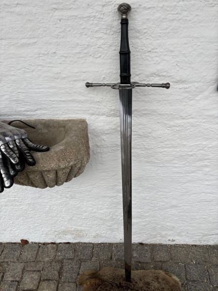 Dieses Langschwert orientiert sich an spätmittelalterlichen und frühneuzeitlichen Waffenformen des späten 15. und frühen 16. Jahrhunderts. Charakteristisch sind die seitlichen Fingerringe an der Parierstange, die zusätzlichen Handschutz boten und den Übergang zur Renaissance-Fechtkunst markieren. Solche Schwerter wurden sowohl von Adligen als auch von gut ausgerüsteten Söldnern getragen und waren für Stich- und Schnitttechniken geeignet.