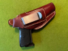 aus weichem dennoch stabilem dunkelbraunen Leder und offen am Lauf, kann sowohl Innenbund oder am Gürtel rechtshand als Linkshand am Gürtel getragen werden. Dier ermöglicht die auch abtrennbare Stahlklemme, hier in einem Beispiel mit einem Modell einer modernen Subcompact