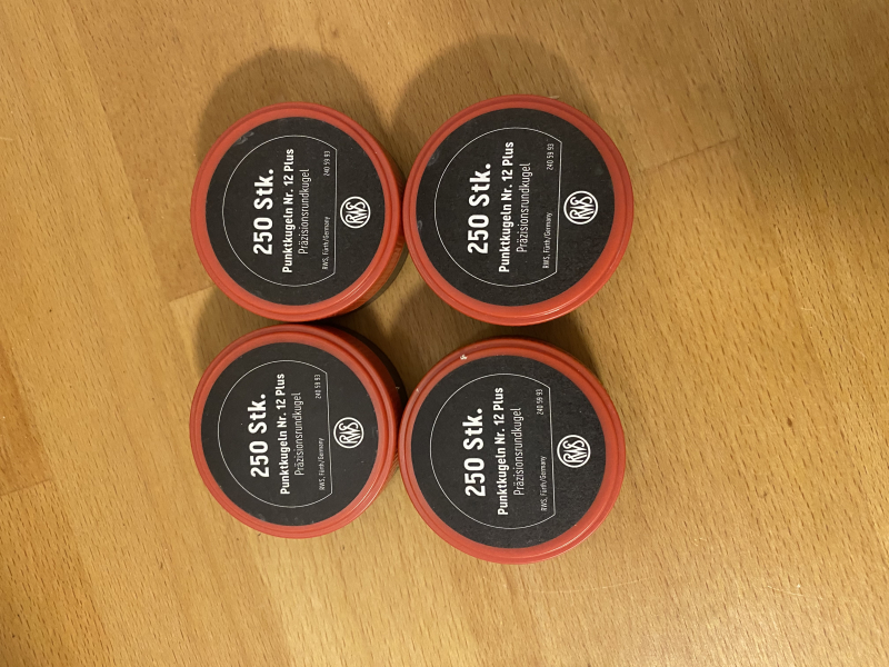 Zum Verkauf kommen Präzisionsrundkugeln Nr. 12 von RWS. Neue Fertigung, höchste Präzision für Zimmerstutzen. Insgesamt 1000 Schuss. Die 4 Dosen wurden noch nicht geöffnet.