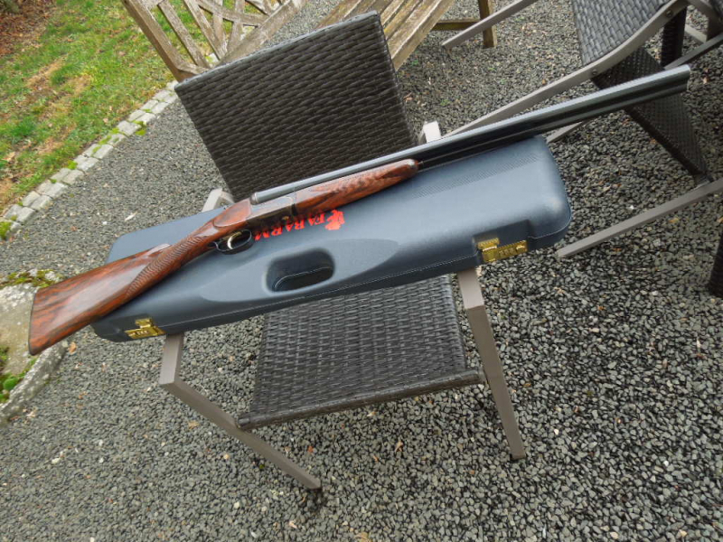 Laufpaar wunderschön hochglanzbruniert, Laufschiene 7/10mm, Hauptkorn aus Messing, System mit Laufumschaltung auf Kolbenhals, Ejektoren