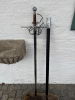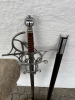 • Gesamtlänge: ca. 115 cm • Gesamtlänge mit Scheide: ca. 123 cm • Klingenlänge: ca. 95 cm • Grifflänge: ca. 20 cm • Gewicht: ca. 1,8 kg (inkl. Scheide) • Klingenmaterial: Federstahl • Klinge: leicht geschärft, Spitze ausgeprägt • Griff: Holzgriff mit dekorativen Metallfäden • Griffmontage: abschraubbar • Gefäß: komplexes Drahtgefäß (Swept Hilt) mit Ringparierstange & Bügeln • Scheide: schwarz, modern gefertigt, Metallmundblech