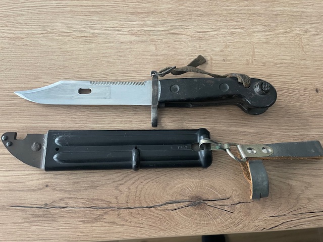 Sie bieten auf ein AK-Bajonett mit Scheide der NVA (DDR). Das Bajonett ist gut erhalten und stammt aus militärischer Sammlung. Leichte Gebrauchsspuren sind vorhanden, ansonsten befindet es sich in ordentlichem Zustand.EU-Versand 26,50€ Auktion frei ab 18 Jahre für nicht ID- Mitglieder nach der Auktion Ausweiss zusenden
