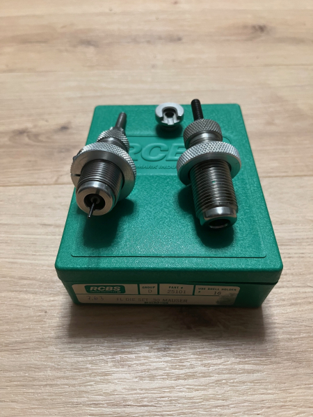Verkaufe einen sehr gut erhaltenen Matrizensatz im Kaliber .30 Mauser bestehend aus Setz und Vollkalibriermatrize und passenden Hülsenhalter.