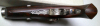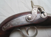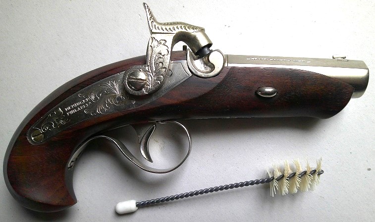 Schussfähige, kleine Perkussions-Taschenpistole „Philadelphia“ im Kaliber .45 von C.O.M. Alle Metallteile sind vernickelt (siehe Bilder). Die Schlossplatte ist mit floralen Gravuren versehen. Wie auf den Bildern zu sehen ist, ist der Lauf auf drei Seiten gestempelt. Der Abzugsbügel ist nicht original. Die Pistole ist ungeschossen. Der Hahn rastet zweimal, die Feder ist sehr stark. Der Lauf ist gezogen. Die Pistole ist ca. 16 cm lang und wiegt rund 245 Gramm. Nylon-Reinigungsbürste ist enthalten.