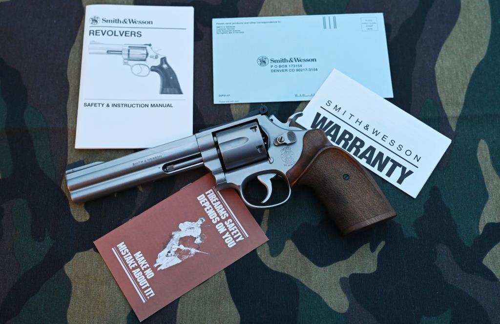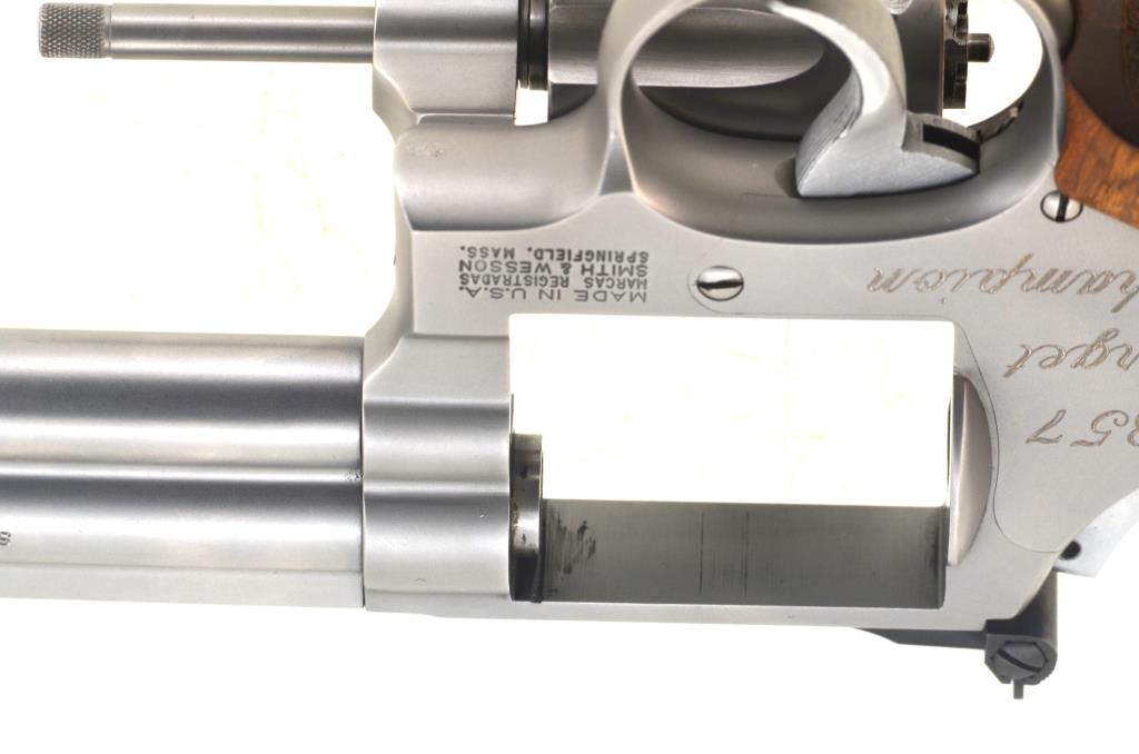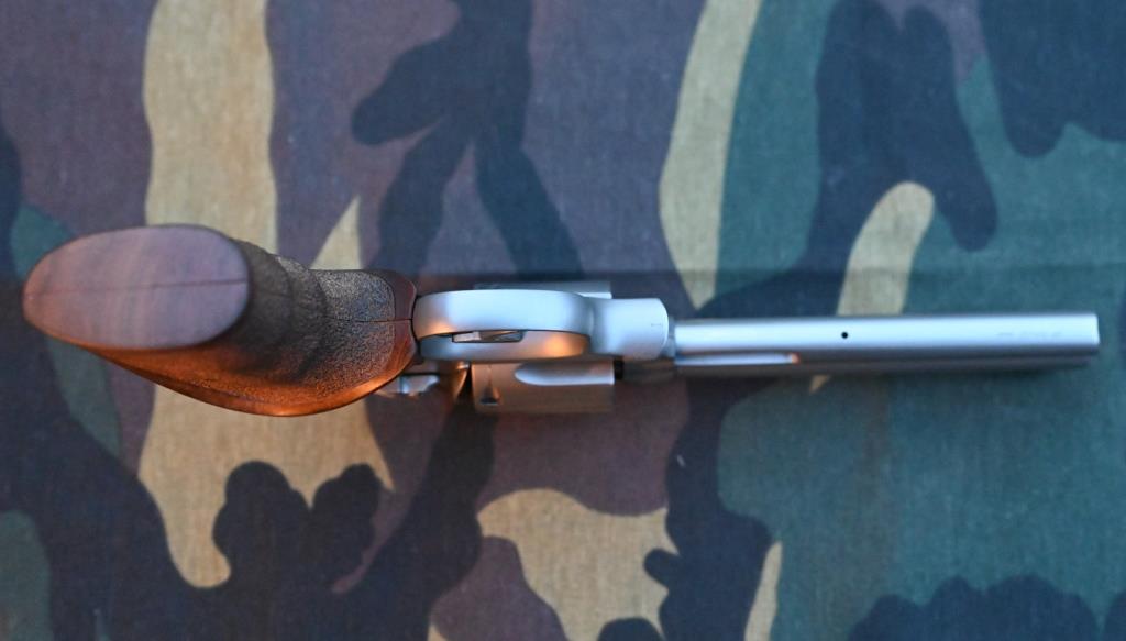 Stainless-Optik, Finish nahezu werksfrisch erhalten, ohne nennenswerte Gebrauchsspuren. Optisch sehr schöner Gesamteindruck, mit extrem wenigen, allesamt nicht nennenswerten Gebrauchsspuren: Es gibt nur ein paar ganz leichte Schmauchspuren rund um den Laufanfang, eine nur leichte, noch nicht gravierende Magnumrille auf der Stegunterseite des Rahmens, und auch noch keine tiefe umlaufende Transportrille auf der Trommel: