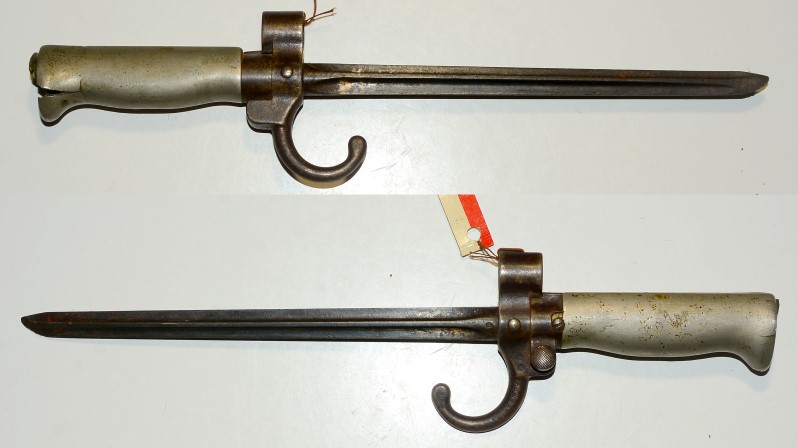 Französischer Behelfs-Gabendolch 1. Weltkrieg, aus einem Lebel Bajonett hergestellt, das wahrscheinlich während des Krieges so beschädigt wurde, dass der Einsatz als Bajonett nicht mehr sinnvoll war, die Klinge auf 20,4cm, der Griffknauf (durch Granatsplitter?) aufgerissen