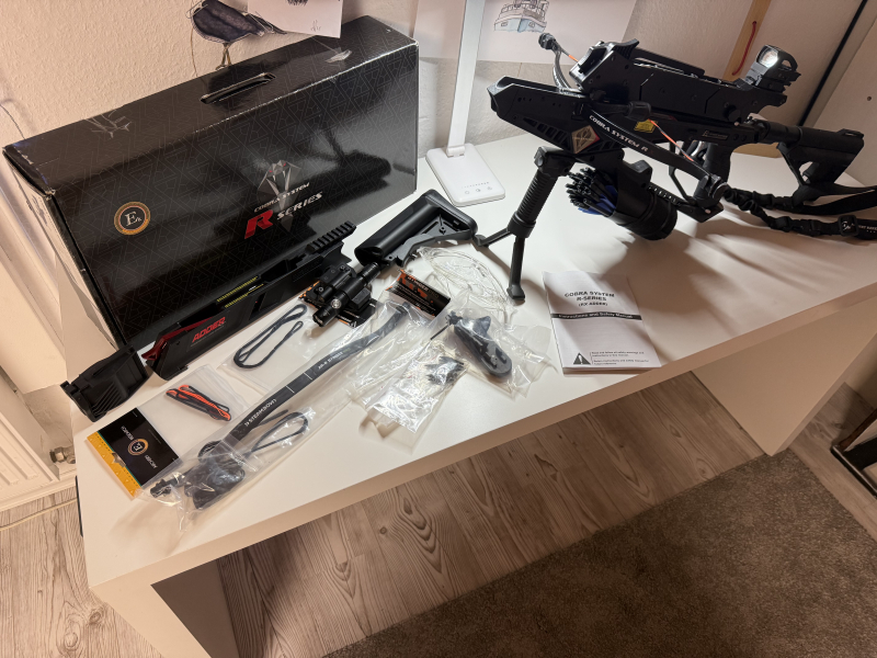 Es ist alles vorhanden und gehört zum Verkauf was Ihr sehen könnt auf den Fotos. Beispielsweise Zusatzwurfarme mit Schnur Ersatzschnur, 2 Buttstock, Sehnefett Kleinteile, Sling, Bipod Frontgriff und so weiter.