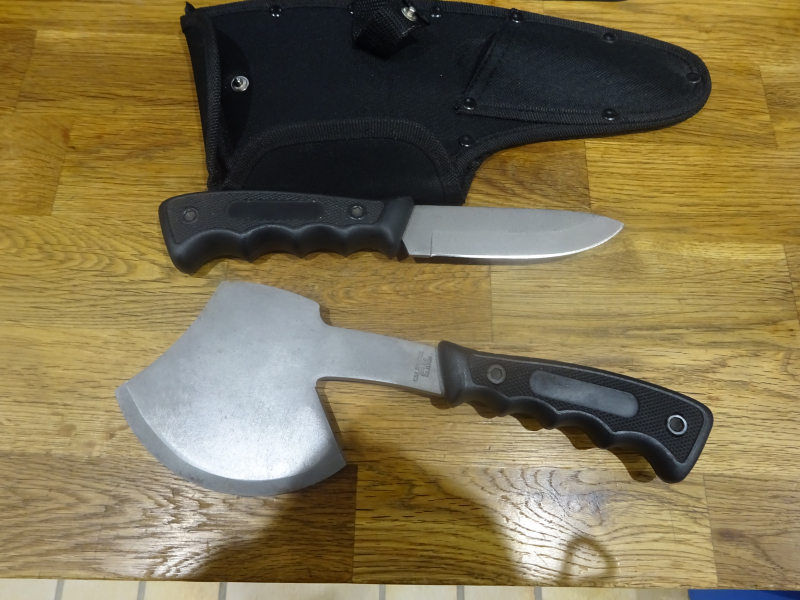 aus einer Geschäftsauflösung: Set mit Beil und Fahrtenmesser von Herbertz, Aisi 420 Stahl, nie benutzt, in passender Scheide, siehe Fotos und mein egun