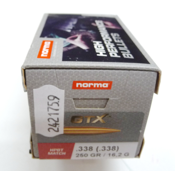 Hier werden 50 Norma Geschosse, .338 Dia., 16,2 Gramm, bzw. 250 grain, GTX angeboten.