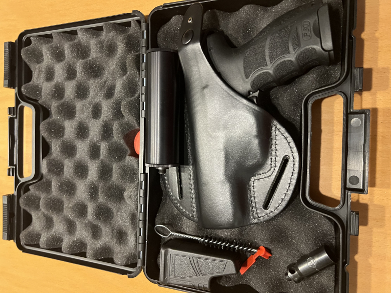 verkauft wird hier meine Heckler & Koch P30 Schreckschuss Pistole Schwarz 9 mm P.A.K. mit viel Zubehör wie z.B. Schalldämpfer, Schnelllader und Holster. Die Heckler & Koch P30 ist eine Gas-Signal Pistole. Sie ist sehr robust gefertigt. Das Modell hat einen Metallschlitten. Ein Highlight sind die funktionierenden Bedienhebel, wie Entspannhebel und Schlittenfanghebel. Weitere Merkmale sind eine Fallsicherung und ein Single-/Double Action Abzug. Die SRS-Pistole kommt im Kaliber 9 mm P.A.K. und ist mit einem 15 Schuss Magazin ausgestattet.