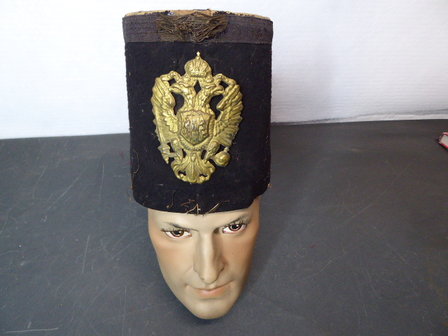 Aus meiner Sammlung gebe ich, ein alten unbekannten hohen Tschako ohne Schirm mit aufgesetzten Geprägten Doppeladler ab. Kenner werden es sicherlich wissen was das für ein Tschako ist. Wahrscheinlich aus Originalteilen für Film und Fernsehen zusammengebaut worden. Korpus mit schwarzen Filz ummantelt oben mit breiter Litze, Deckel aus Leder oder Gelackten Leinen? Vorne angebrachte originale Auflage Doppeladler aus Geprägten Messing. Innen mit Originalem Futter und Schweißband. Mit etwas Geschick kann man das Teil sicherlich wieder Herrichten. Alles andere entnehmen Sie Bitte den Fotos. Kann zu jederzeit bei mir besichtigt werden. Privatauktion keine Rücknahme und Garantie.