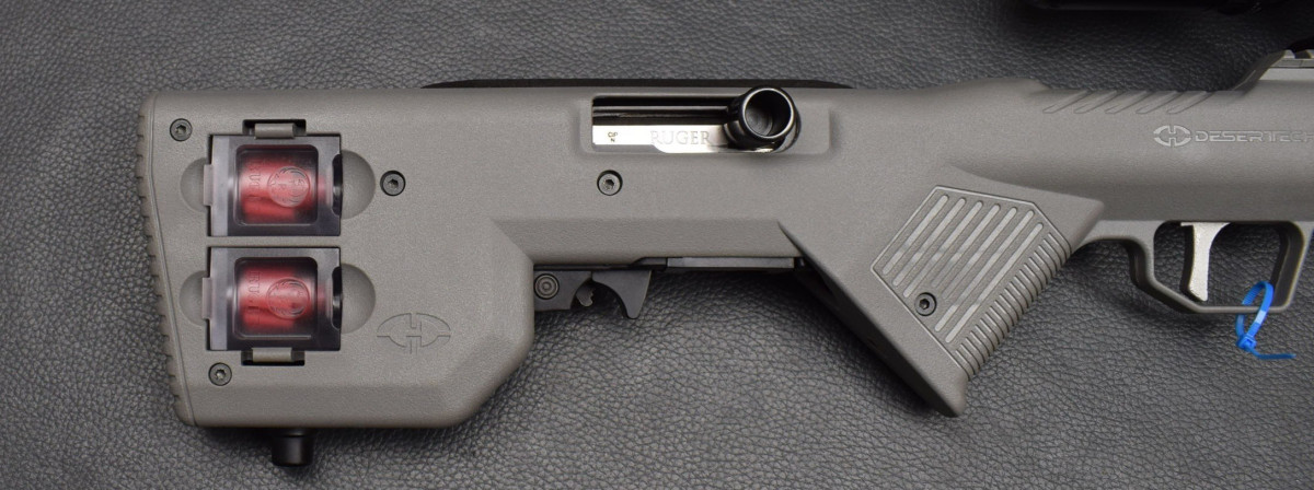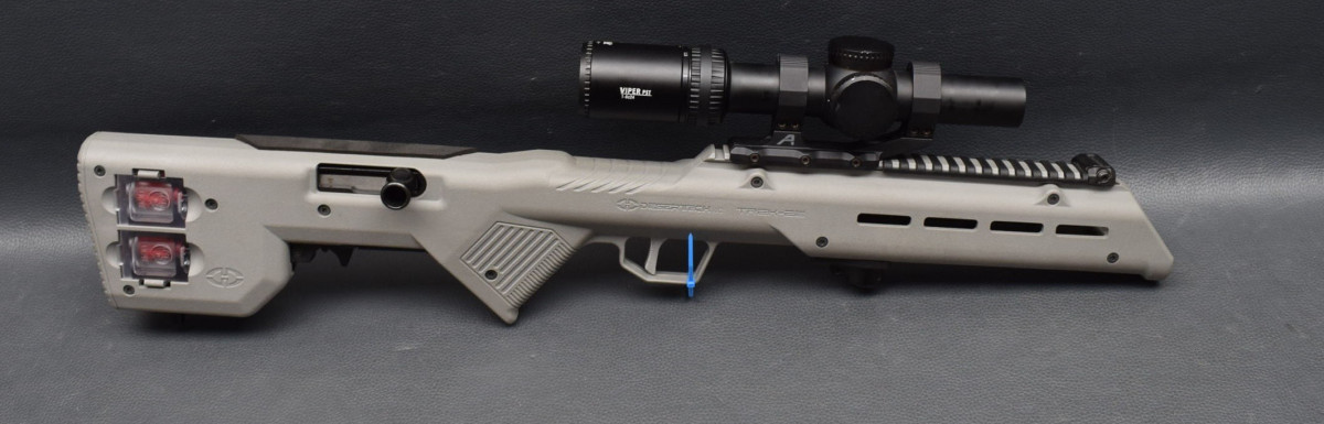 rot/grün, mittels einer Aufkippmontage. Desert Tech Kunststoffschaft grau, mit zwei Ersatzmagazinen.