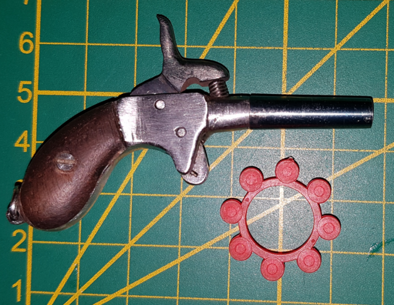 miniatur derringer ca.6,5 cm stahl,nussbaum griffschalen mit funktion zum überarbeiten ! alter und herkunft unbekannt aus nachlass.funktion mit rws 1075 nicht geprüft.privatverkauf,keine garantie,keine rücknahme.nur mit deutscher lieferadresse,keine inseln bitte My gun beachten ! das bild ist stark vergrössert !!!