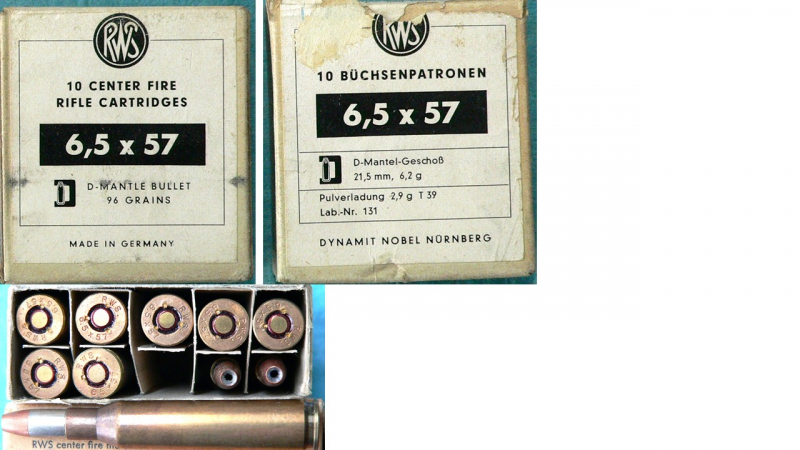 Eine geöffnete Schachtel im Kaliber 6,5 x 57 vermutlich aus den 60er Jahren.
