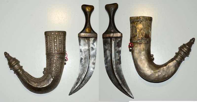 Jambia Dolch mit Horngriff, 19,8 cm lange Klinge, ob die reich verzierte Scheide aus Silber oder nur versilbert ist, konnte ich nicht feststellen.
