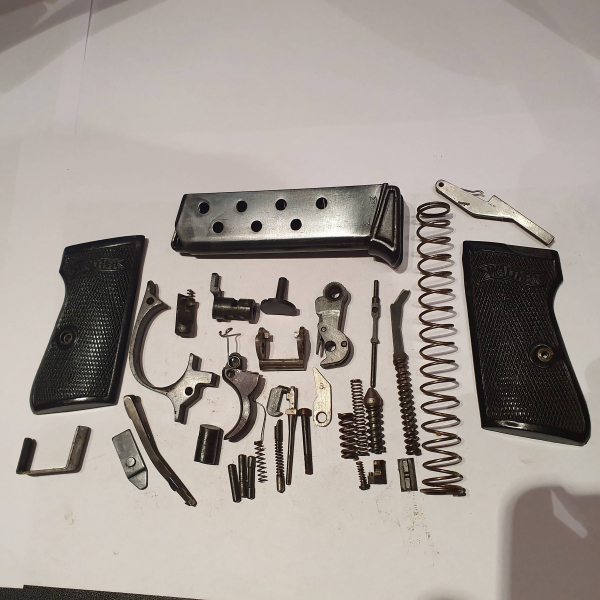 Aus meiner Sammlung: Originale Ersatzteile Pistole Walther Zella Mehlis, Mod. PP, Kal. 7,65 mm. Originales Magazin Zella-Mehlis mit schwarzer Griffverlängerung und früher Walther-Schleife, originale frühe ZM-Griffschalen mit Metalleinlage. Alles ohne Beschädigungen und neuwertig! Alle Teile wie auf dem Bild abgebildet und frei zu erwerben. Versand nur an eine deutsche Adresse. Kein Versand in das Ausland.