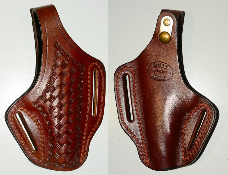Gürtelholster für Revolver mittlerer Größe, etwa S&W M60, Länge 18cm, Breite 12,5cm, geprägtes Basketwave-Muster, Hersteller "Brian G. Foster", sehr guter Zustand mit minimalem Abrieb innen.