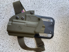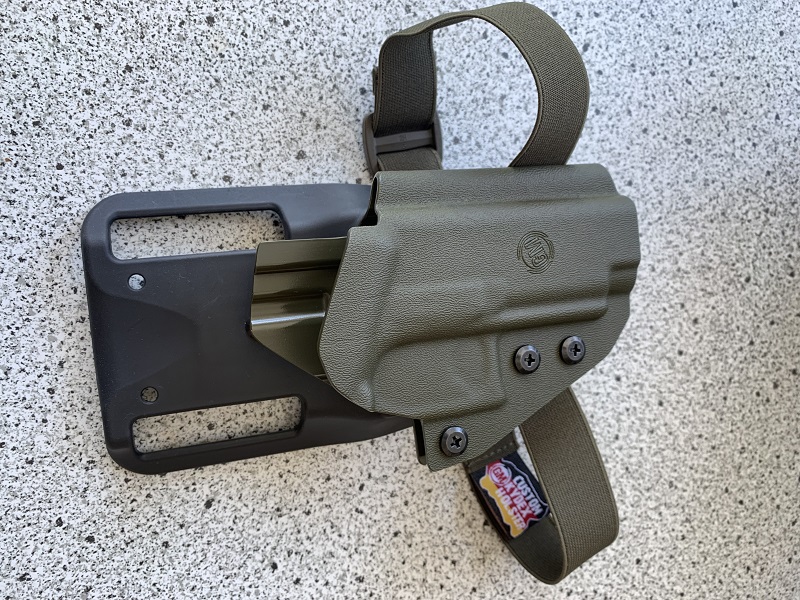 Level 1 Retention Holster in Oliv mit Blade-Tech Duty Montagebrücke in mid-ride Höhe.