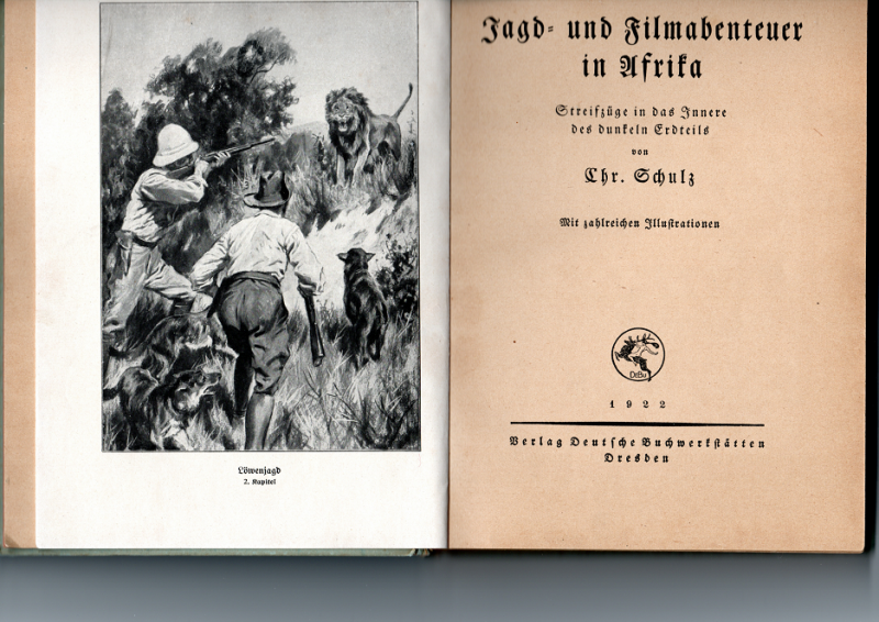 Jagd und Abenteuer in Afrika, Chr. Schulz, Jagen, Filmen und Wildtierfang für den Zoo Hagenbeck in Hamburg, 154 Seiten mit vielen alten Fotos, Ausgabe 1922