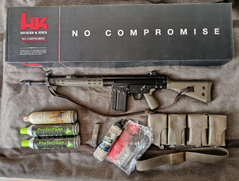 Angeboten wird ein wenig gebrauchtes Softair GBB Gewehr Heckler & Koch G3 inklusive umfangreichem Zubehör.